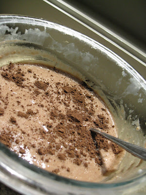 5. In the morning, add the sweetener (I used stevia), cocoa powder, and chocolate chips to the mixture. Then, using a hand blender, blend to your little hearts' content. The less you blend, the more chewy/chunky your sundae will be.